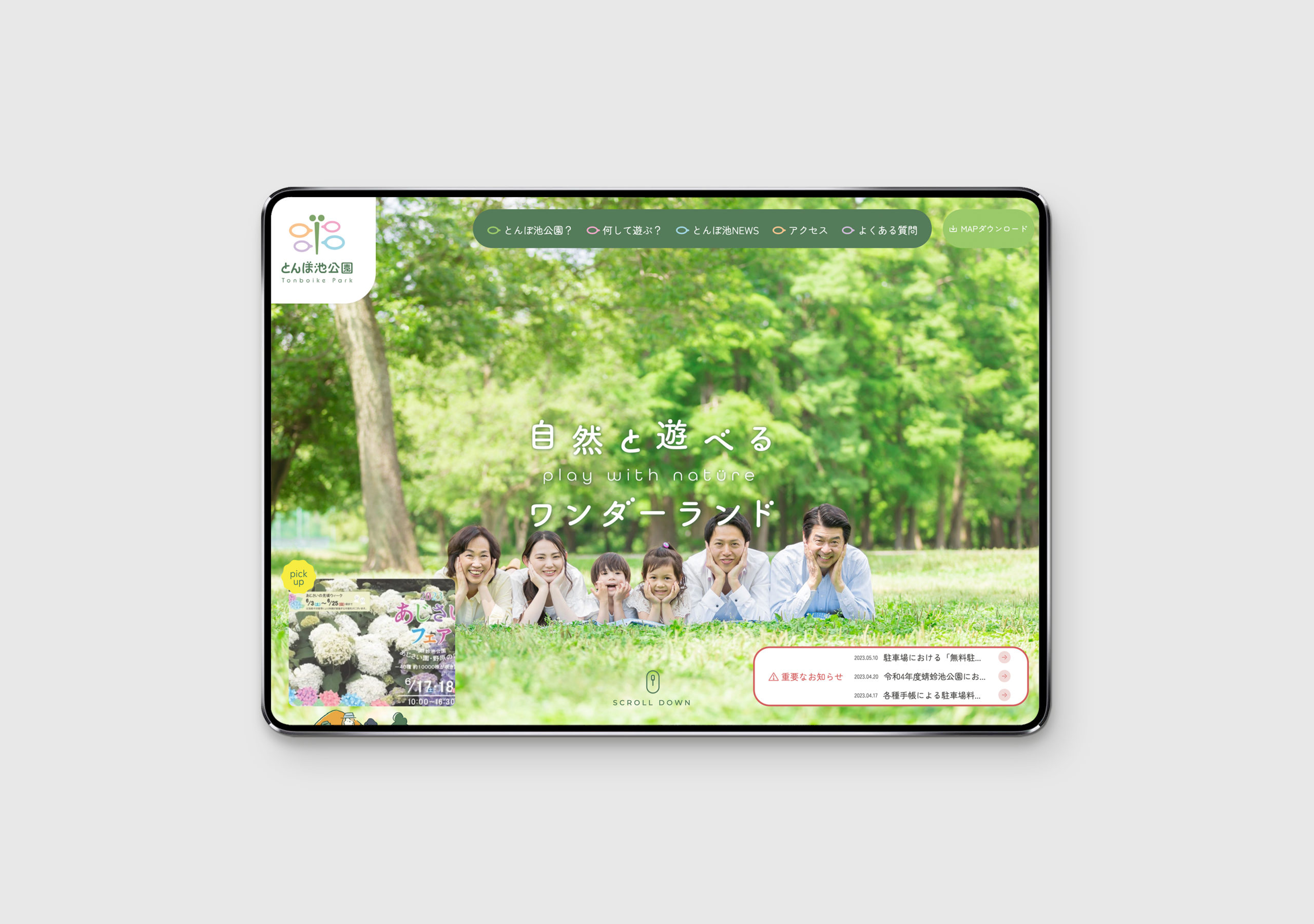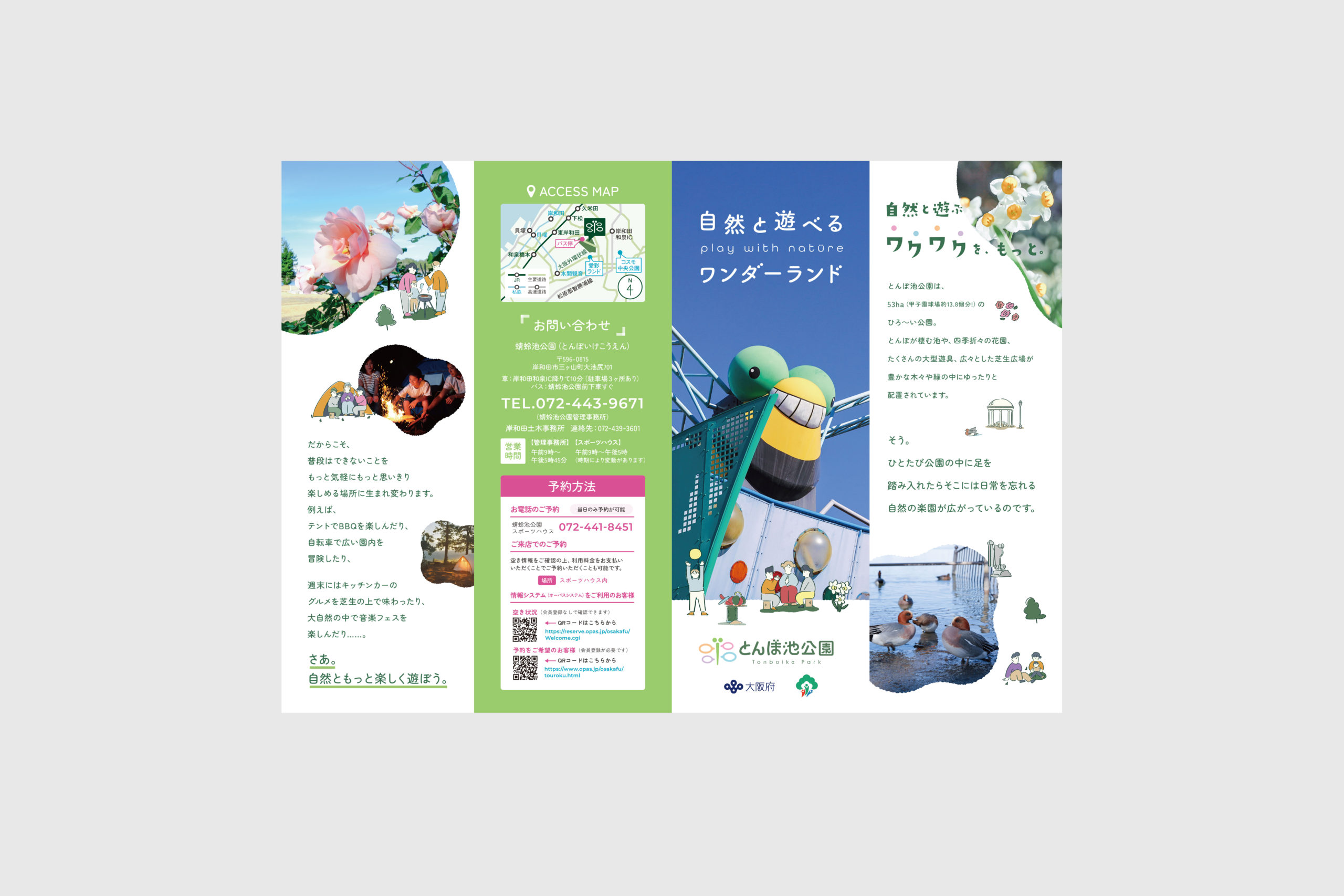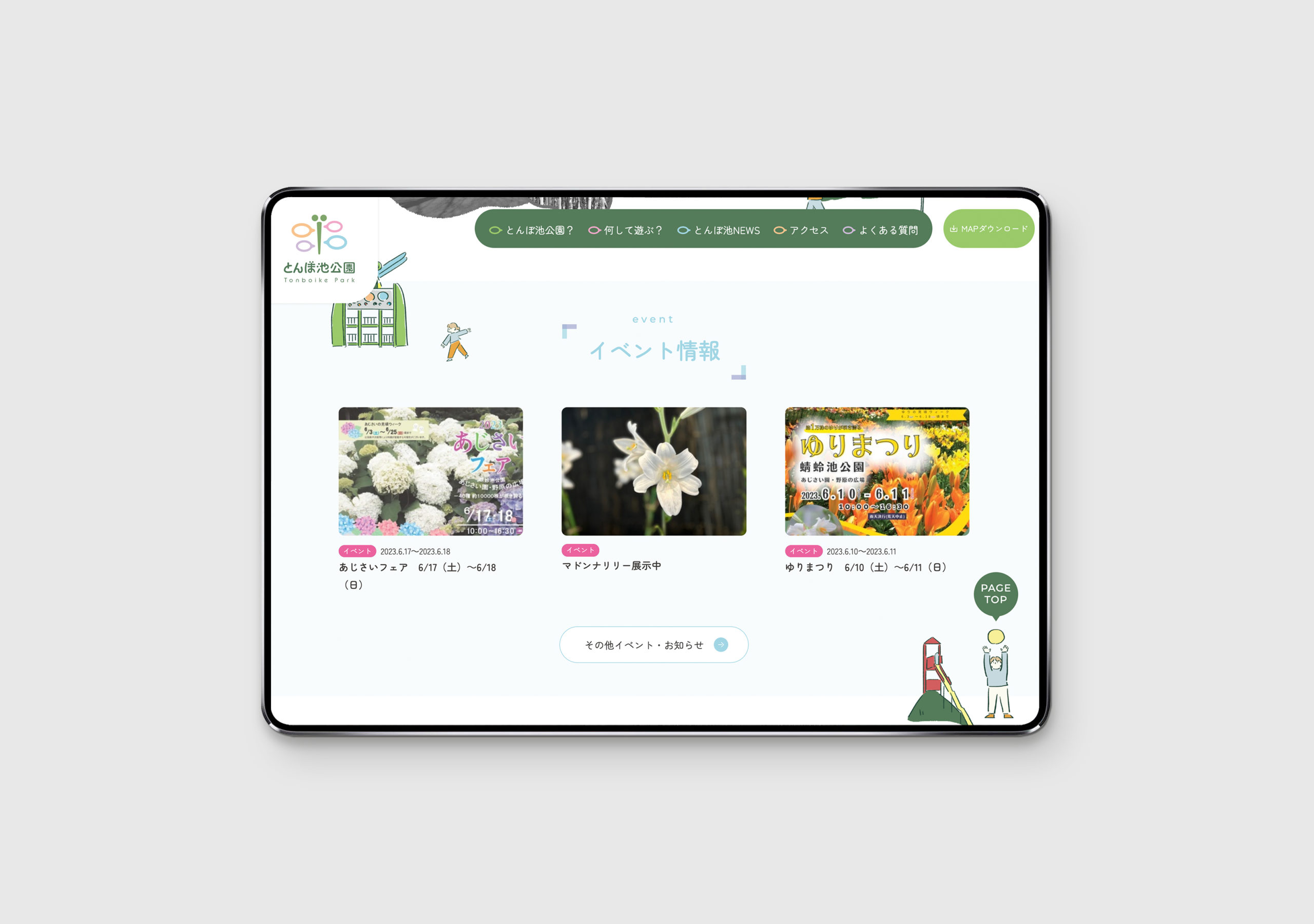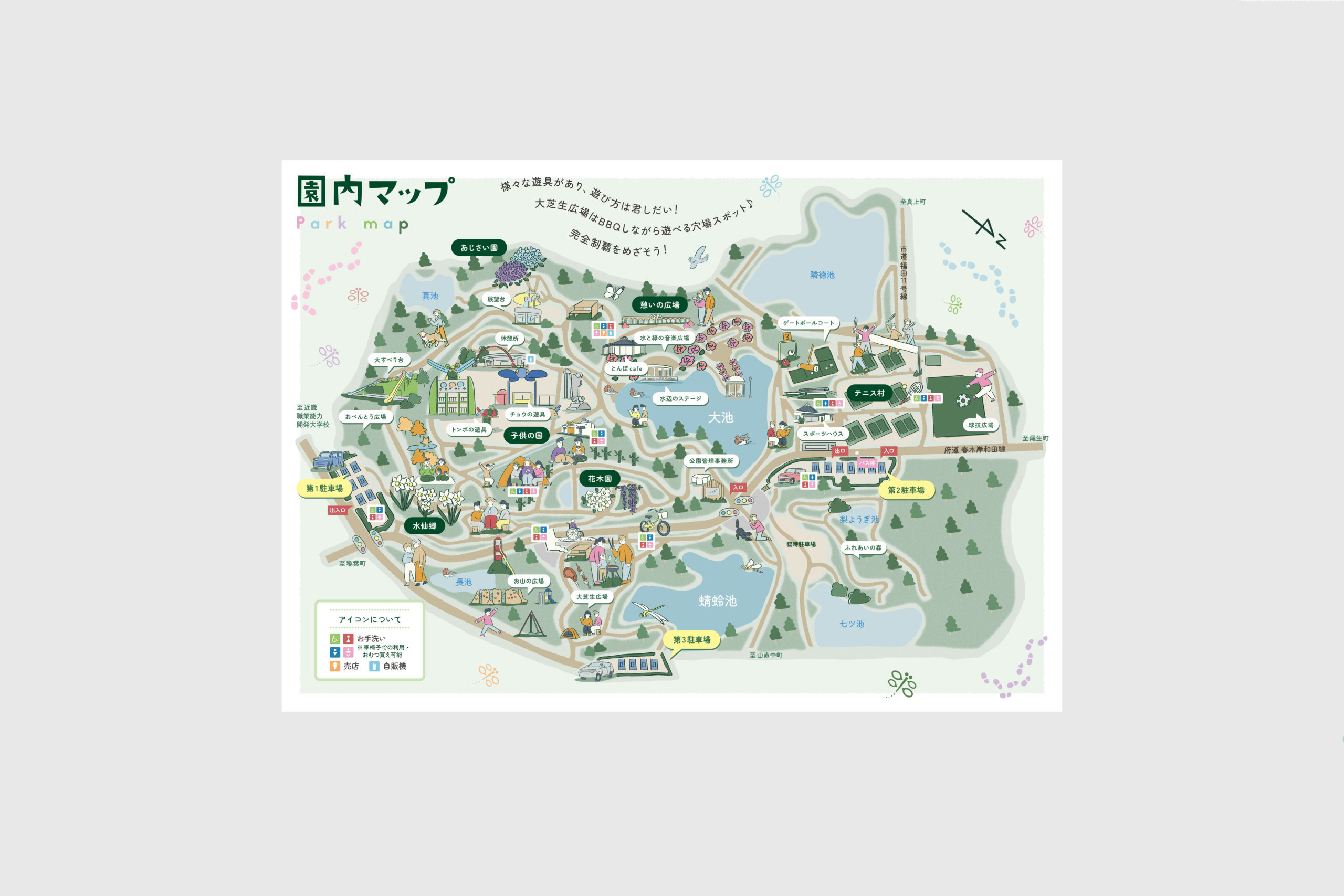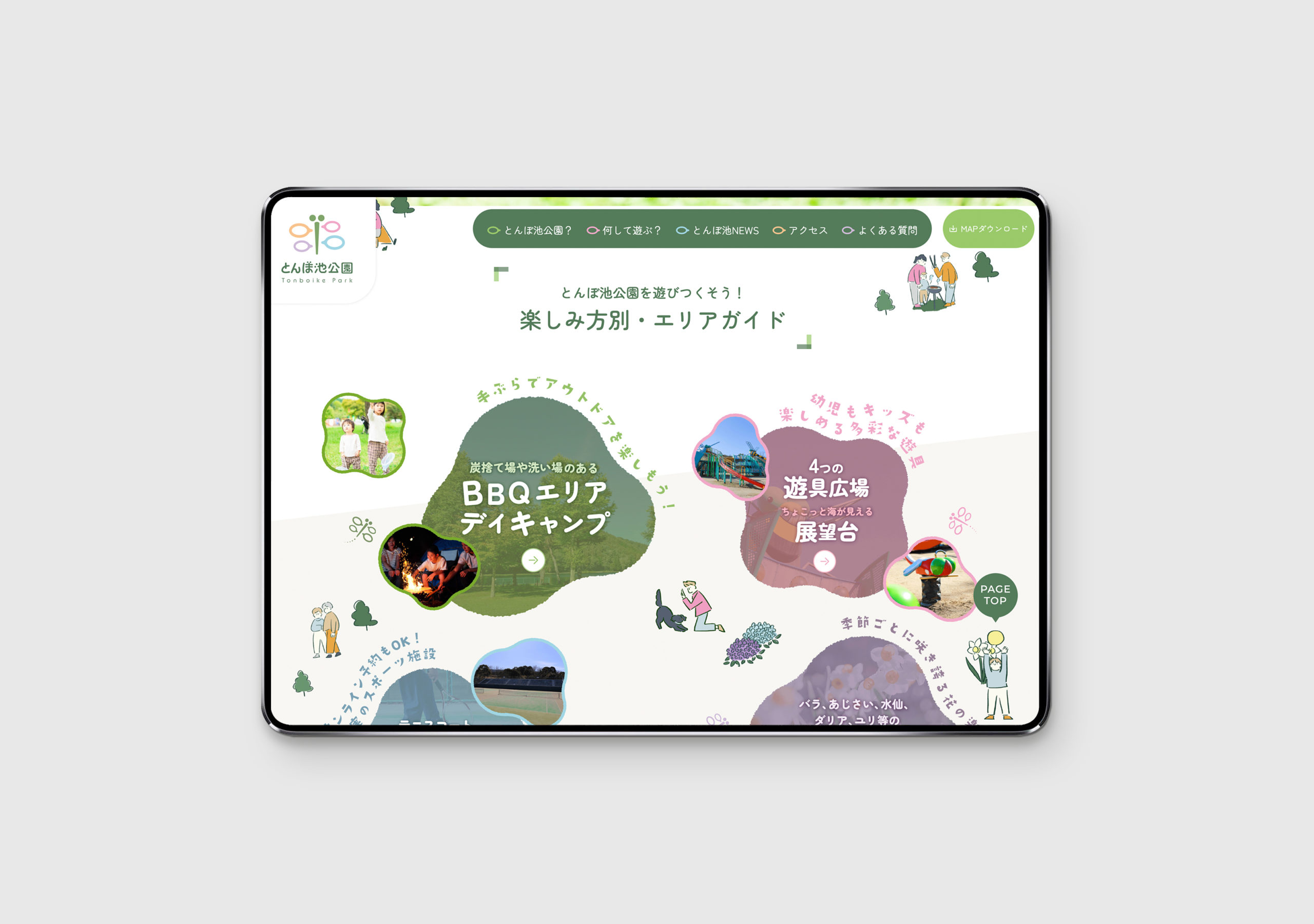 大阪府岸和田市にある蜻蛉池公園(とんぼ池公園) たくさんの池やトンボの遊具があり、四季折々の花々とともに楽しめる公園です。 現地取材にいき、実際に体感。その上でイラストも制作しています。 ロゴは認知しやすさを考え、トンボをモチーフにデザインし、たくさんの人の声・(賑やかさ)が飛び交うをコンセプトに制作しています。 WEBはイラストを交え、あそび心を。 イラストマップもぜひダウンロードしてみてください。