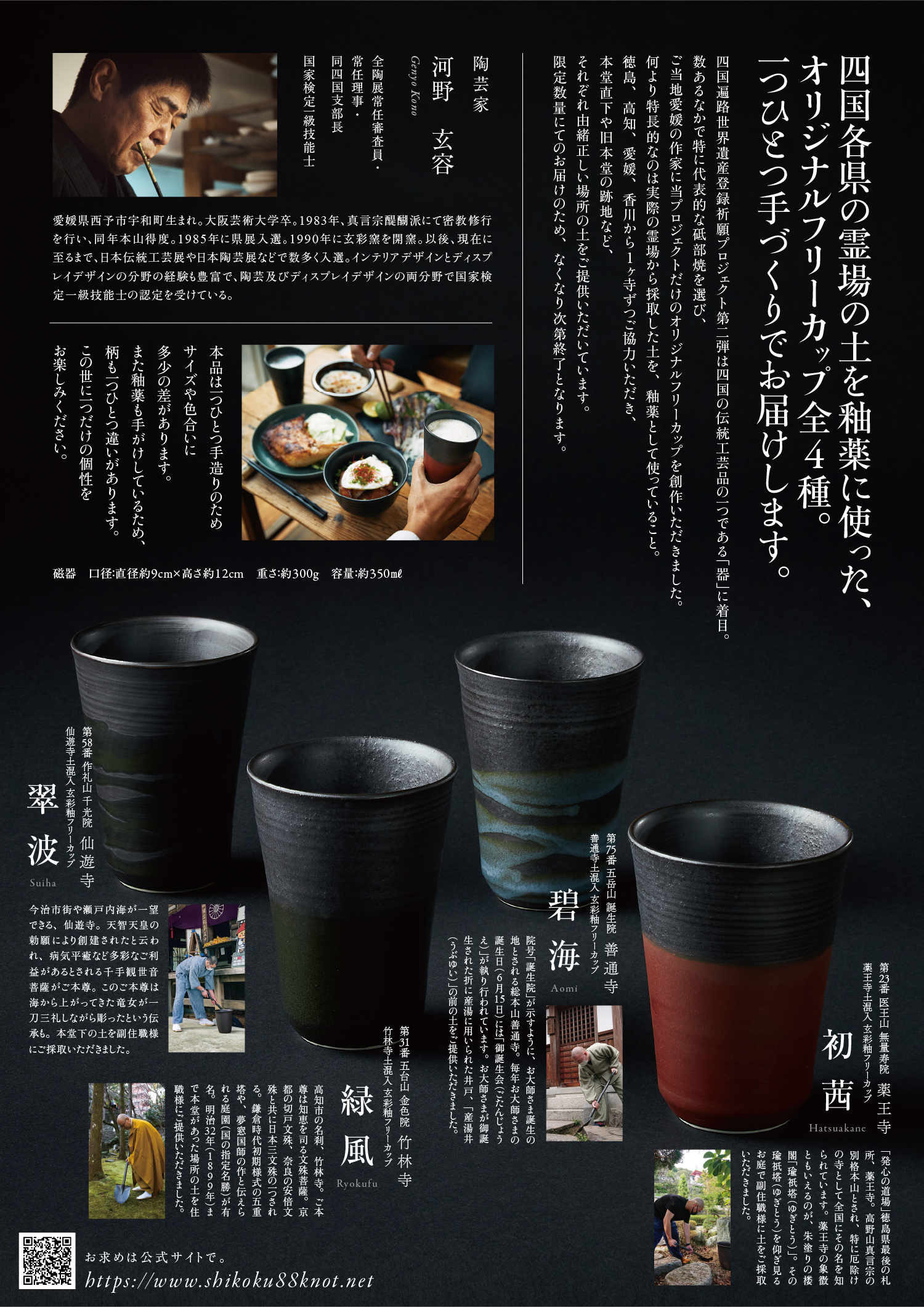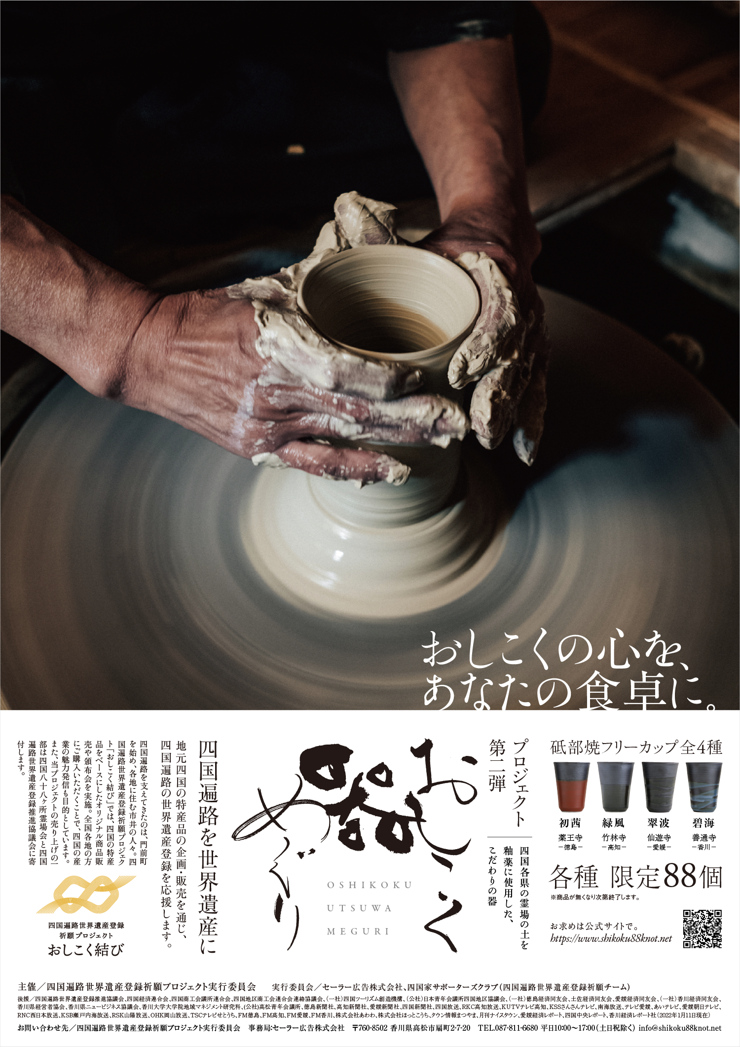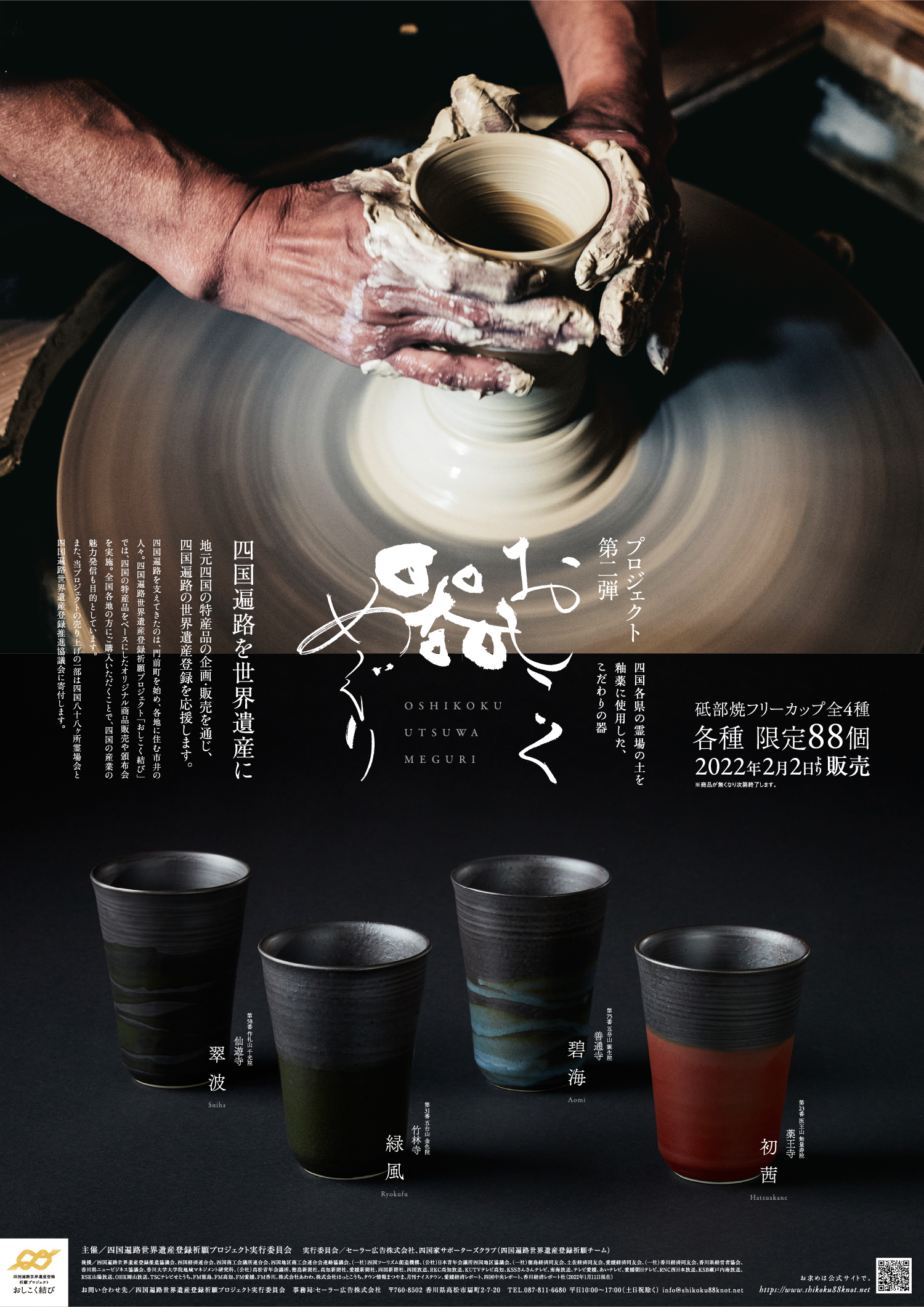 四国遍路世界遺産祈願プロジェクト第ニ弾「おしこく器めぐり」のポスターデザイン。 ポスター以外にも、ロゴマーク、チラシ、新聞広告、プロモーションムービー、パッケージデザインなど、総合的に監修・制作しました。 四国愛媛の伝統工芸品の一つ「砥部焼」に着目し、四国各県の霊場から採取した土を釉薬(ゆうやく)に使用した4つのオリジナル器です。 商品はWEBサイトから購入いただけます。
