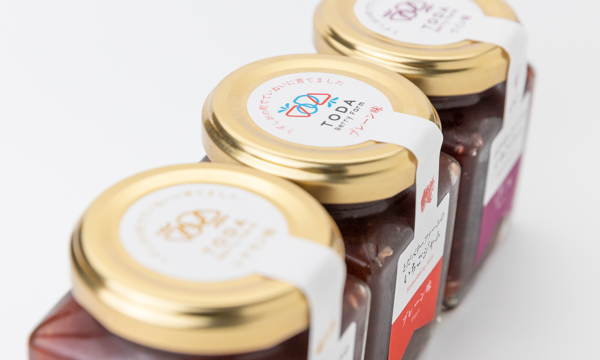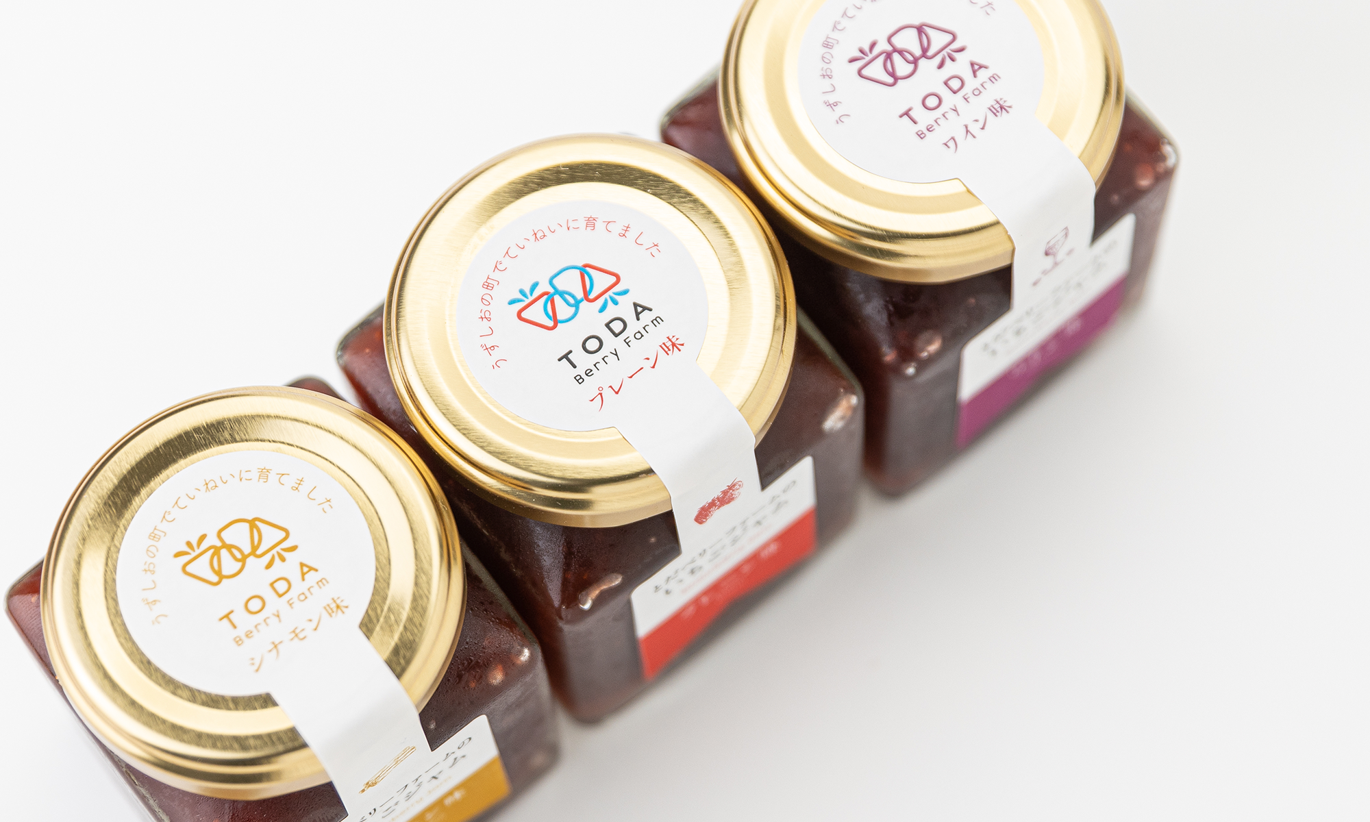徳島県鳴門市の観光農園「TODA Berry Farm」より、ブランド苺「うずしおベリー®」を使った**いちごジャム(3種セット)**のパッケージデザインを担当。廃校(旧北灘西小学校)を活用した農園のストーリーを背景に、フレーバーごとの色分けとミニマルな構成で、手に取りやすい佇まいに整えました。